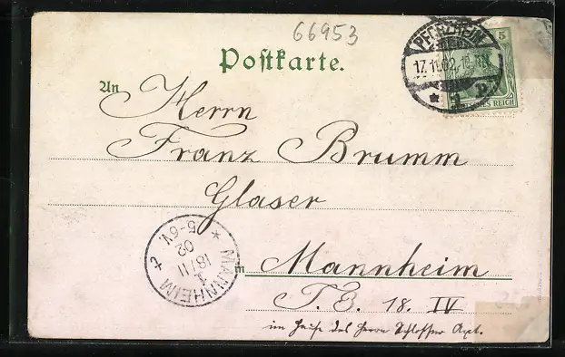 gelaufen 1902, geklebte Eckknicke li., guter Zustand