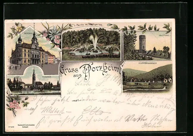 Lithographie Pforzheim, Rathaus, Wertthurm, Kupferhammer