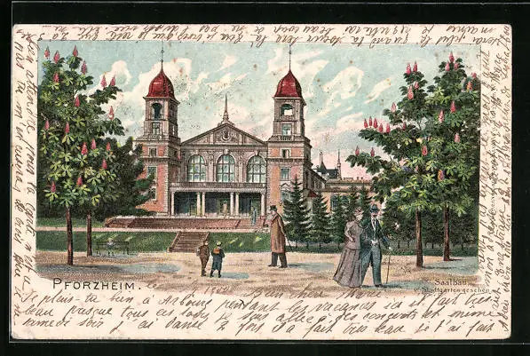 Lithographie Pforzheim, Saalbau vom Stadtgarten gesehen