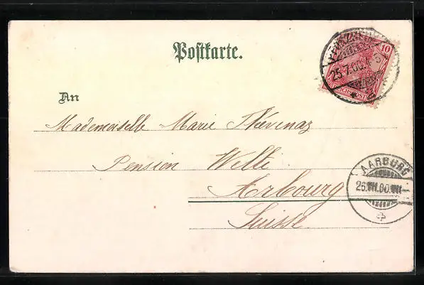 gelaufen 1900, Eckknicke li. unten u. re. oben, Bugspur li. unten, Stempelspur, guter Zustand