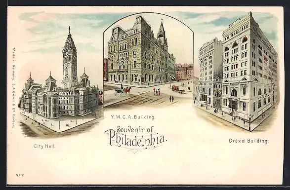 Lithographie Philadelphia, PA, City Hall, Y. M. C. A. Building, Drexel Building