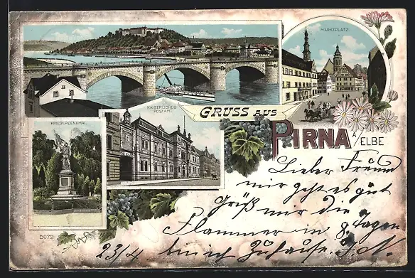 Lithographie Pirna /Elbe, Marktplatz, Kriegerdenkmal, Postamt, Elbbrücke mit Ortsansicht