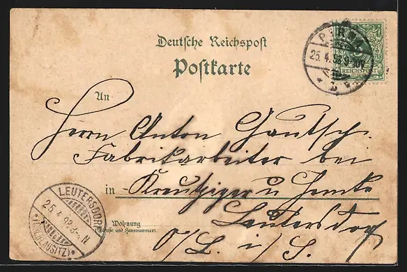 Personenbezogene Daten auf der Rückseite der Karte wurden durch blauen Textmarker unkenntlich gemacht. Die blauen Stellen sind auf die Vorderseite durchgeweicht und wirken sich negativ auf das Postkartenfoto aus