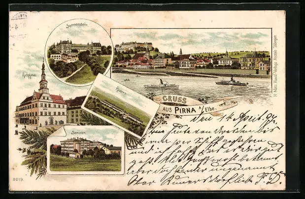 Lithographie Pirna /Elbe, Rathaus, Kaserne, Sonnenstein