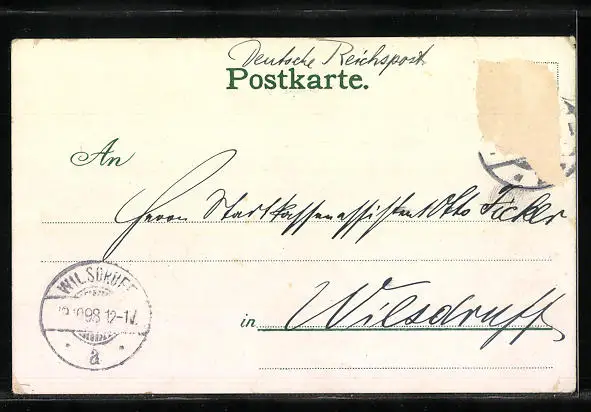 Personenbezogene Daten auf der Rückseite der Karte wurden durch blauen Textmarker unkenntlich gemacht. Die blauen Stellen sind auf die Vorderseite durchgeweicht und wirken sich negativ auf das Postkartenfoto aus