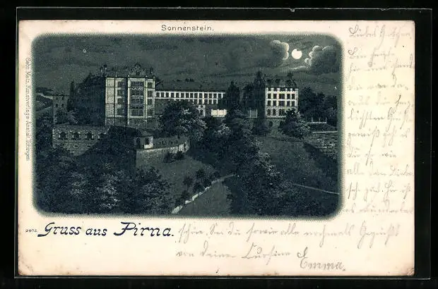 Lithographie Pirna, Sonnenstein bei Mondschein
