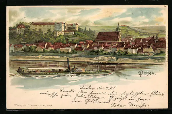 Lithographie Pirna, Uferpartie mit Dampfer Pirna