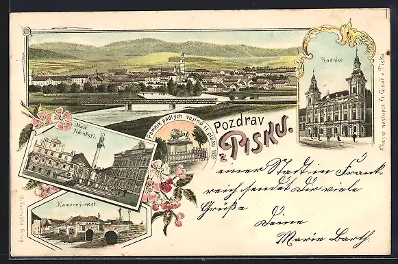 Lithographie Pisek, Radnice, Malé Námestí, Kamenný most, Pomnik padlých