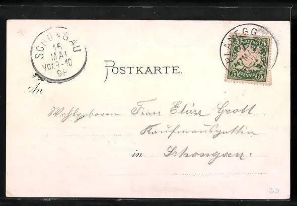 Personenbezogene Daten auf der Rückseite der Karte wurden durch blauen Textmarker unkenntlich gemacht. Die blauen Stellen sind auf die Vorderseite durchgeweicht und wirken sich negativ auf das Postkartenfoto aus