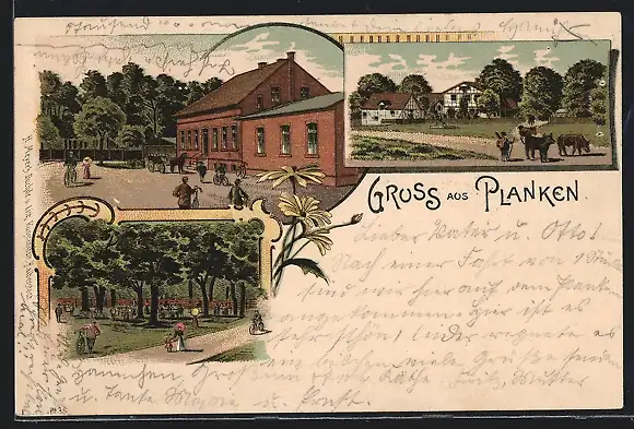 Lithographie Planken, Gasthaus, Gehöft, Park
