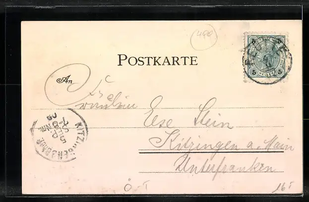 Personenbezogene Daten auf der Rückseite der Karte wurden durch blauen Textmarker unkenntlich gemacht. Die blauen Stellen sind auf die Vorderseite durchgeweicht und wirken sich negativ auf das Postkartenfoto aus