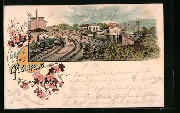 Lithographie Pleinfeld, Ortspartie mit Bahngleisen