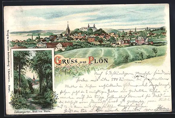 Lithographie Plön, Schlosgarten, Blick vom Stern, Ortsansicht