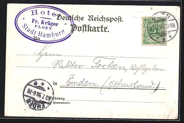 Personenbezogene Daten auf der Rückseite der Karte wurden durch blauen Textmarker unkenntlich gemacht. Die blauen Stellen sind auf die Vorderseite durchgeweicht und wirken sich negativ auf das Postkartenfoto aus