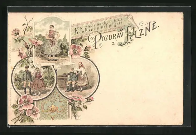 Lithographie Plzen, Frau in Tracht, Paar in Tracht
