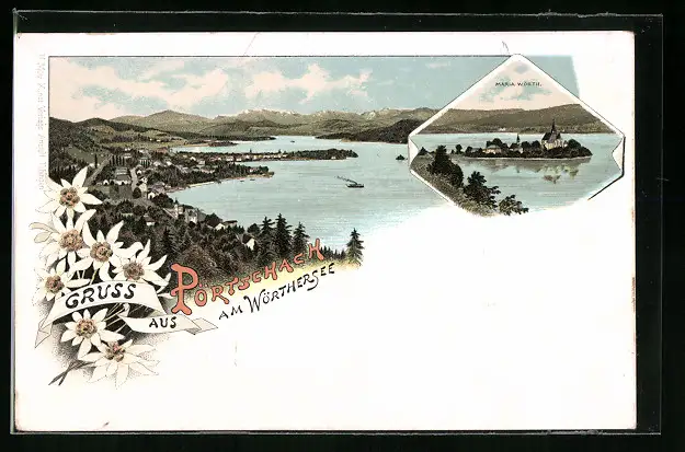 Lithographie Pörtschach a. Wörthersee, Ortsansicht mit Maria Wörth