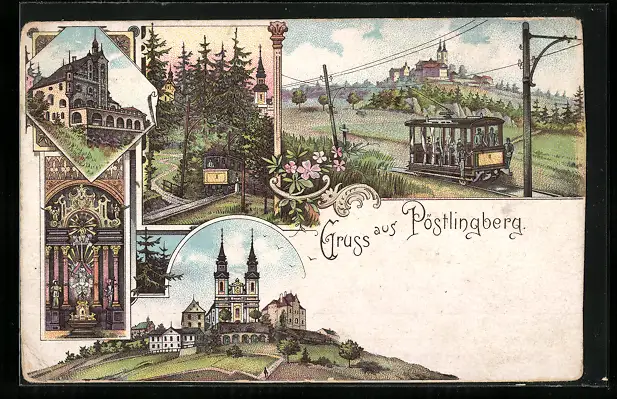 Lithographie Pöstlingberg, Bergbahn, Kirche mit Altar