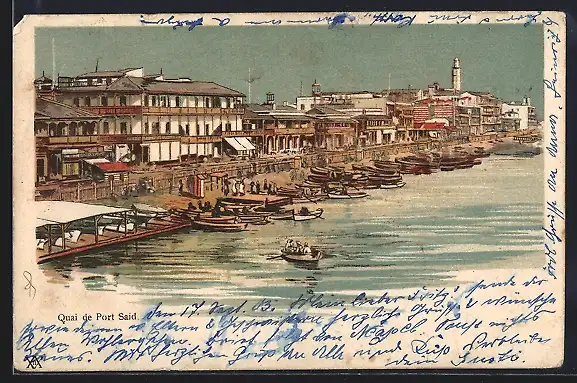 Lithographie Port Said, Gebäude am Wasser, in der Ferne der Leuchtturm