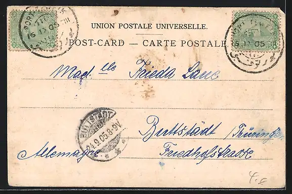gelaufen 1905, Ecken bestoßen, Eckknick oben li, guter Zustand