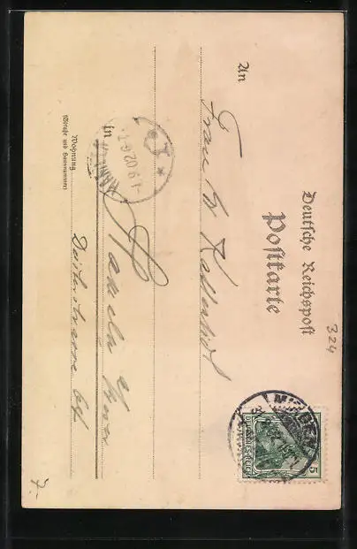 Personenbezogene Daten auf der Rückseite der Karte wurden durch blauen Textmarker unkenntlich gemacht. Die blauen Stellen sind auf die Vorderseite durchgeweicht und wirken sich negativ auf das Postkartenfoto aus