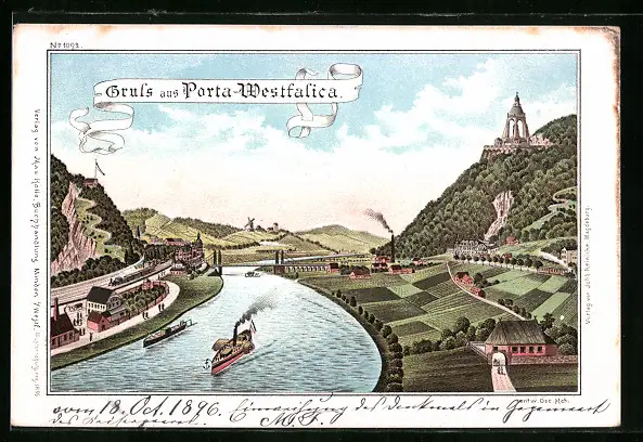 Lithographie Porta Westfalica, Totalansicht mit Weser und Kaiser-Wilhelm-Denkmal