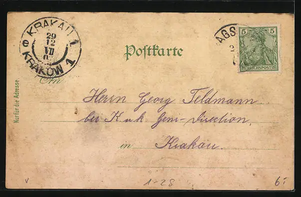 Personenbezogene Daten auf der Rückseite der Karte wurden durch blauen Textmarker unkenntlich gemacht. Die blauen Stellen sind auf die Vorderseite durchgeweicht und wirken sich negativ auf das Postkartenfoto aus