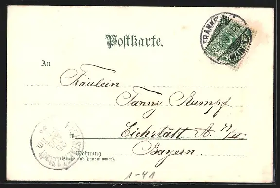 Personenbezogene Daten auf der Rückseite der Karte wurden durch blauen Textmarker unkenntlich gemacht. Die blauen Stellen sind auf die Vorderseite durchgeweicht und wirken sich negativ auf das Postkartenfoto aus