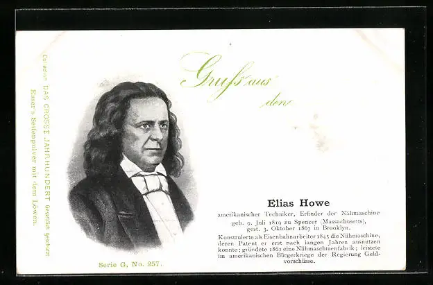 Lithographie Portrait des amerikanischen Erfinders Elias Howe, gelebt von 1819 bis 1867