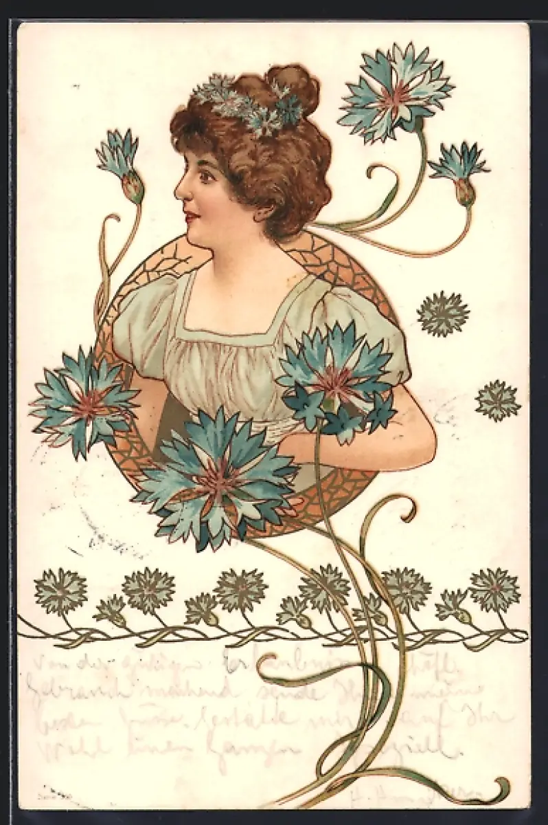 Lithographie Portrait einer Frau mit Kornblumen im Haar, Jugendstil