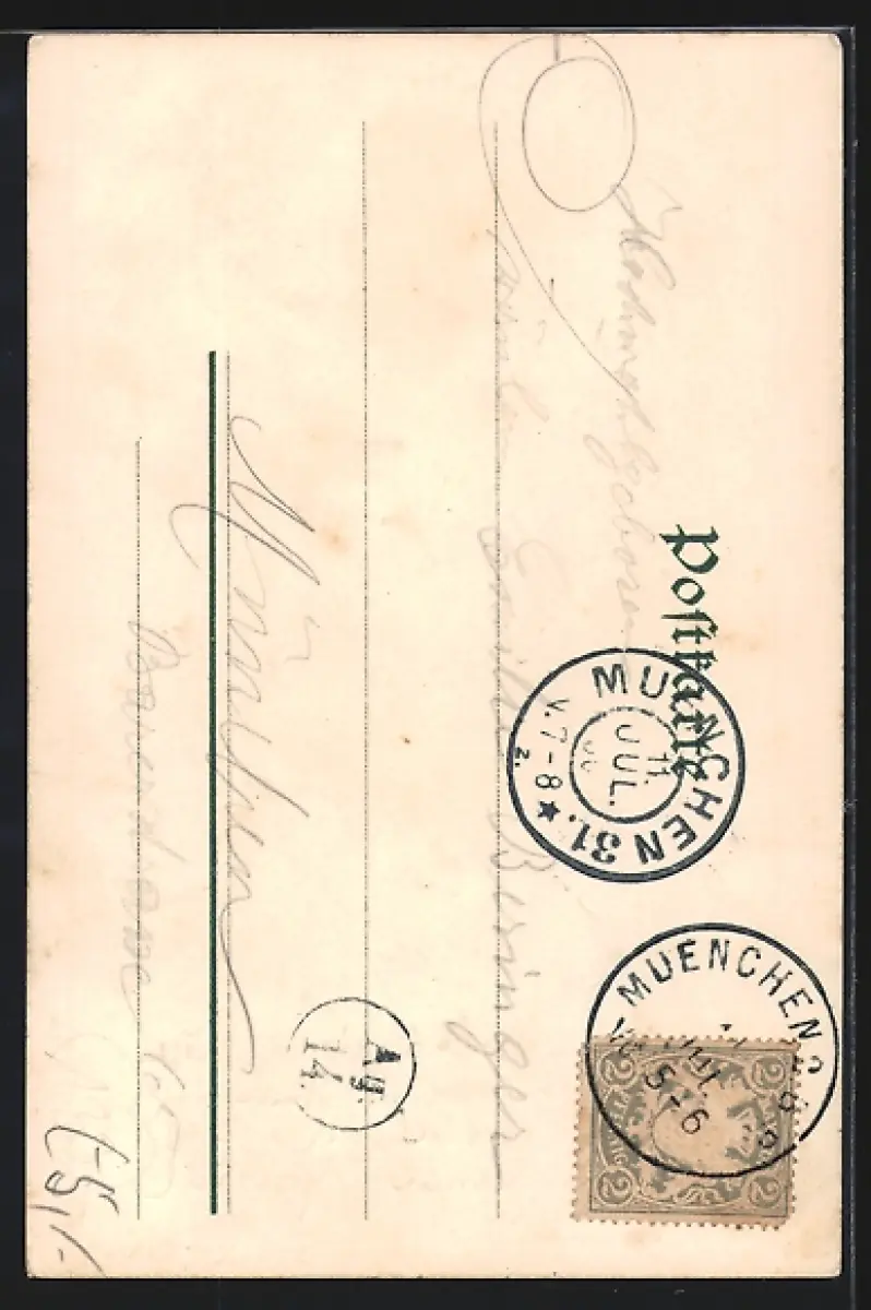 Personenbezogene Daten auf der Rückseite der Karte wurden durch blauen Textmarker unkenntlich gemacht. Die blauen Stellen sind auf die Vorderseite durchgeweicht und wirken sich negativ auf das Postkartenfoto aus