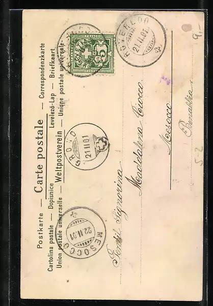 Personenbezogene Daten auf der Rückseite der Karte wurden durch blauen Textmarker unkenntlich gemacht. Die blauen Stellen sind auf die Vorderseite durchgeweicht und wirken sich negativ auf das Postkartenfoto aus