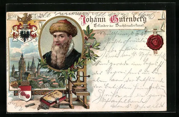 Lithographie Portrait von Johann Gutenberg, Erfinder der Buchdruckkunst