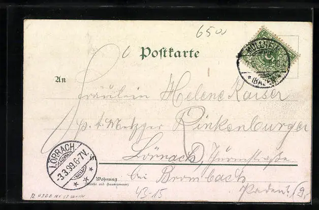 Personenbezogene Daten auf der Rückseite der Karte wurden durch blauen Textmarker unkenntlich gemacht. Die blauen Stellen sind auf die Vorderseite durchgeweicht und wirken sich negativ auf das Postkartenfoto aus