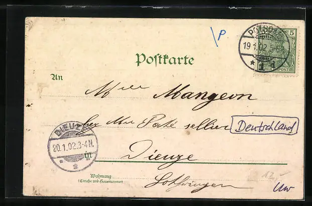 Personenbezogene Daten auf der Rückseite der Karte wurden durch blauen Textmarker unkenntlich gemacht. Die blauen Stellen sind auf die Vorderseite durchgeweicht und wirken sich negativ auf das Postkartenfoto aus