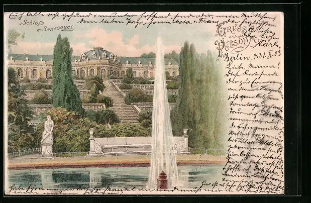 Lithographie Potsdam, Schloss Sanssouci mit Fontäne
