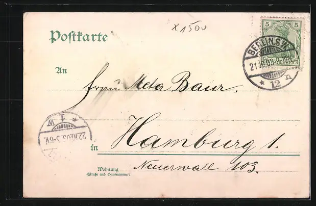 Personenbezogene Daten auf der Rückseite der Karte wurden durch blauen Textmarker unkenntlich gemacht. Die blauen Stellen sind auf die Vorderseite durchgeweicht und wirken sich negativ auf das Postkartenfoto aus