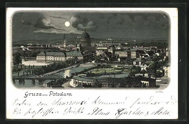 Lithographie Potsdam, Teilansicht bei Mondschein