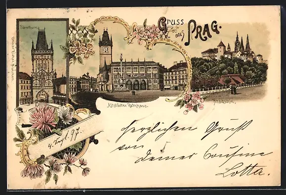 Lithographie Prag / Praha, Altstädter Rathaus, Pulverturm, Hradschin