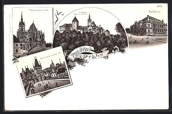 Lithographie Prag / Praha, Dom St. Veit, Der Hradschin, Rudolfinum