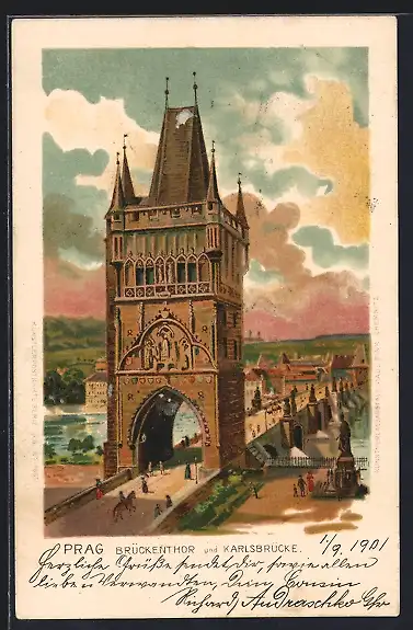 Lithographie Prag, das Brückentor samt Karlsbrücke
