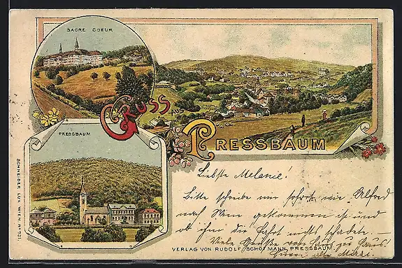 Lithographie Pressbaum, Sacre Coeur, Ortsansicht mit Kirche