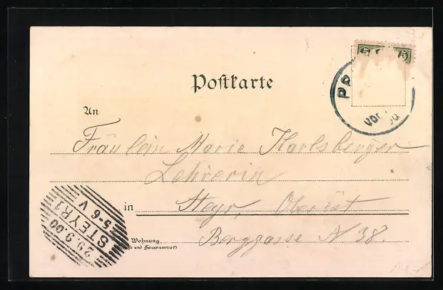 gelaufen 1900, Briefmarke tw. entfernt, rückseitig Oberflächenschaden, Eckknick re. unten, Stempelspur, guter Zustand