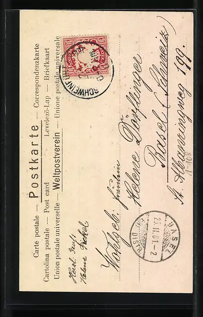 Personenbezogene Daten auf der Rückseite der Karte wurden durch blauen Textmarker unkenntlich gemacht. Die blauen Stellen sind auf die Vorderseite durchgeweicht und wirken sich negativ auf das Postkartenfoto aus
