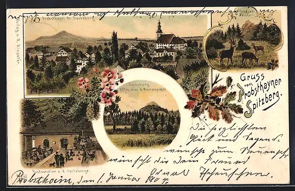Lithographie Probsthayn, Gasthaus Restauration a. d. Spitzberge, Spitzberg, Ortsansicht