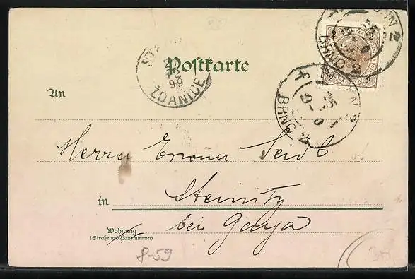 Personenbezogene Daten auf der Rückseite der Karte wurden durch blauen Textmarker unkenntlich gemacht. Die blauen Stellen sind auf die Vorderseite durchgeweicht und wirken sich negativ auf das Postkartenfoto aus