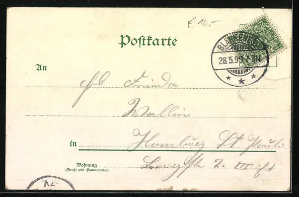 gelaufen 1899, Eckknick li. oben, Bugspur li., Einriss unten, guter Zustand