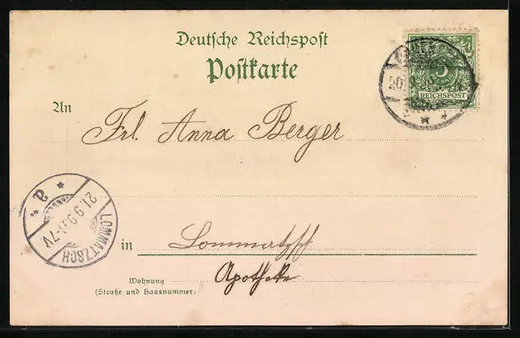 Personenbezogene Daten auf der Rückseite der Karte wurden durch blauen Textmarker unkenntlich gemacht. Die blauen Stellen sind auf die Vorderseite durchgeweicht und wirken sich negativ auf das Postkartenfoto aus