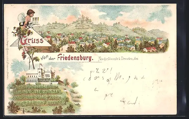 Lithographie Radebeul-Niederlössnitz, Friedensburg und Generalansicht