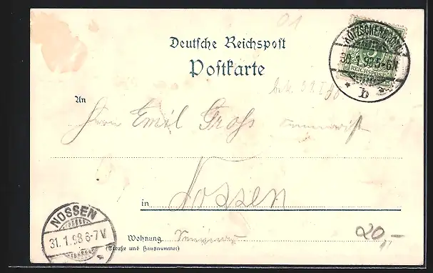Personenbezogene Daten auf der Rückseite der Karte wurden durch blauen Textmarker unkenntlich gemacht. Die blauen Stellen sind auf die Vorderseite durchgeweicht und wirken sich negativ auf das Postkartenfoto aus