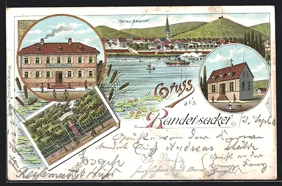 Lithographie Randersacker, Gasthaus zum Bären, Ludwigs-Garten, Totalansicht